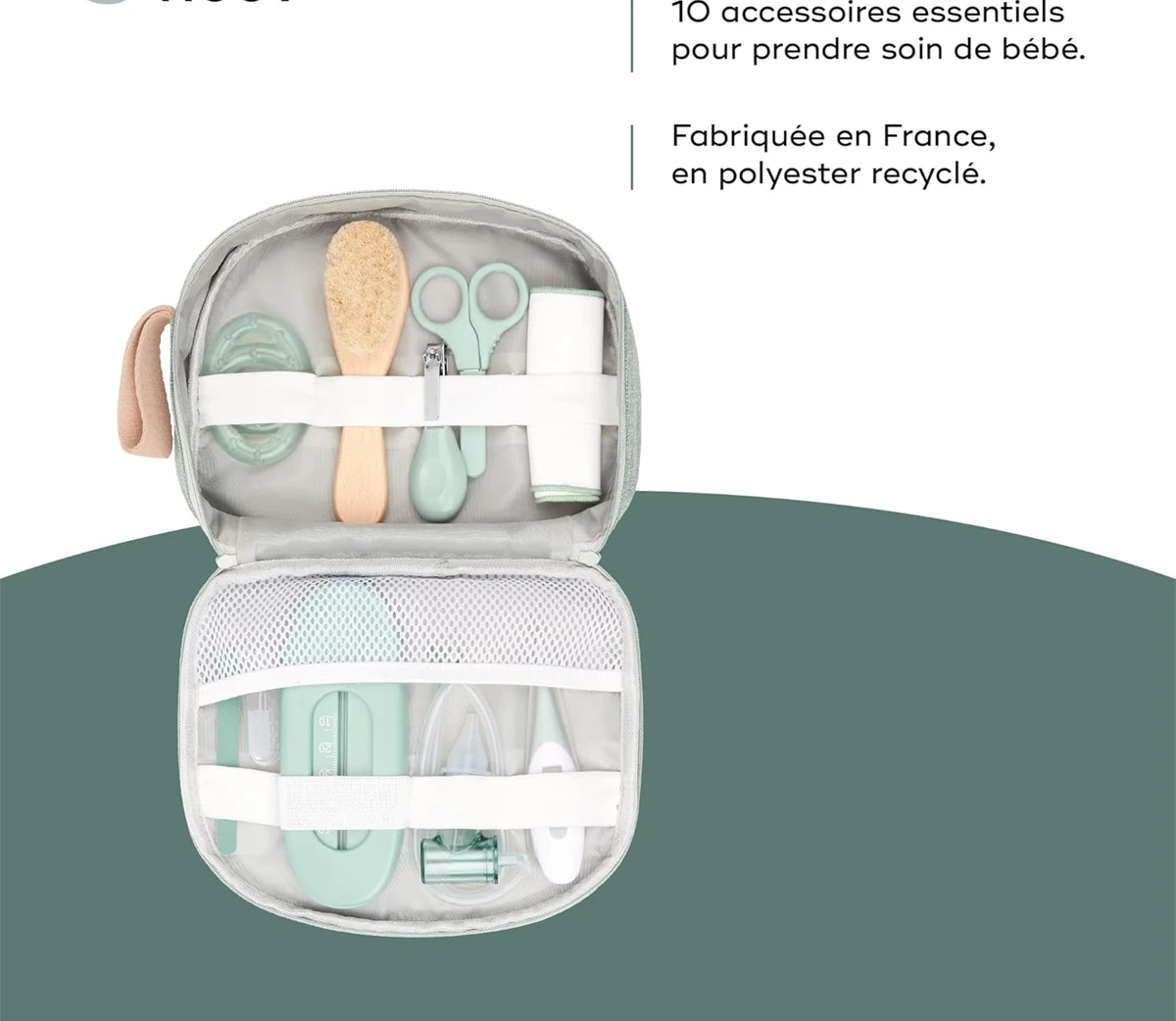 - Ez a kis, elegáns babápolási készlet ideális utazáshoz gyermekével. Könnyen elfér a babakocsiban, pelenkázóban vagy akár a táskában is. A készlet nagy, összehajtható táska formájú, és hat alapvető babaápolási kiegészítőt tartalmaz: kefét, digitális hőmérőt, ollót, körömreszelőt, fogkefét és átlátszó tartályt. Praktikus, több rugalmas belső rekesszel rendelkezik, hogy a kiegészítők tiszták és rendezettek maradjanak. A külső cipzáras zseb könnyű tárolást biztosít. Ez a nagy fogantyús babápolási készlet felakasztható és a fürdőszobában is tárolható.