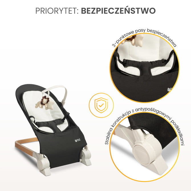 - fejlett biztonság – a legkisebbek védelmére a PINE biztonsági övekkel van felszerelve, amelyek megakadályozzák, hogy a baba kieszen a hintaszékből