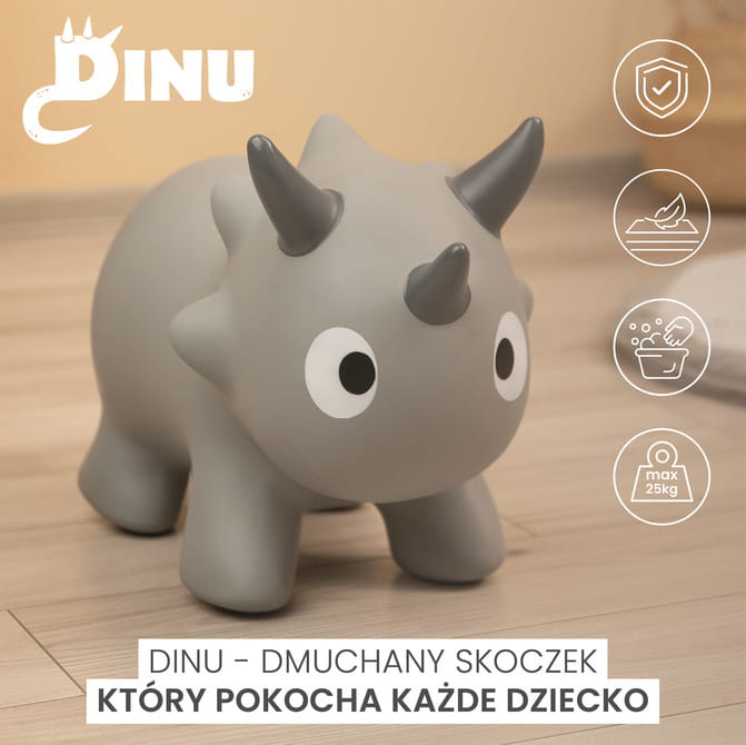 Ismerd meg Dinu-t – a felfújható ugrálót, amely aranyos triceratopsz formájában rengeteg örömet és mozgást biztosít a kicsiknek. A Dinu tökéletes választás az aktív játékhoz és a legkisebbek mozgáskoordinációjának fejlesztéséhez.