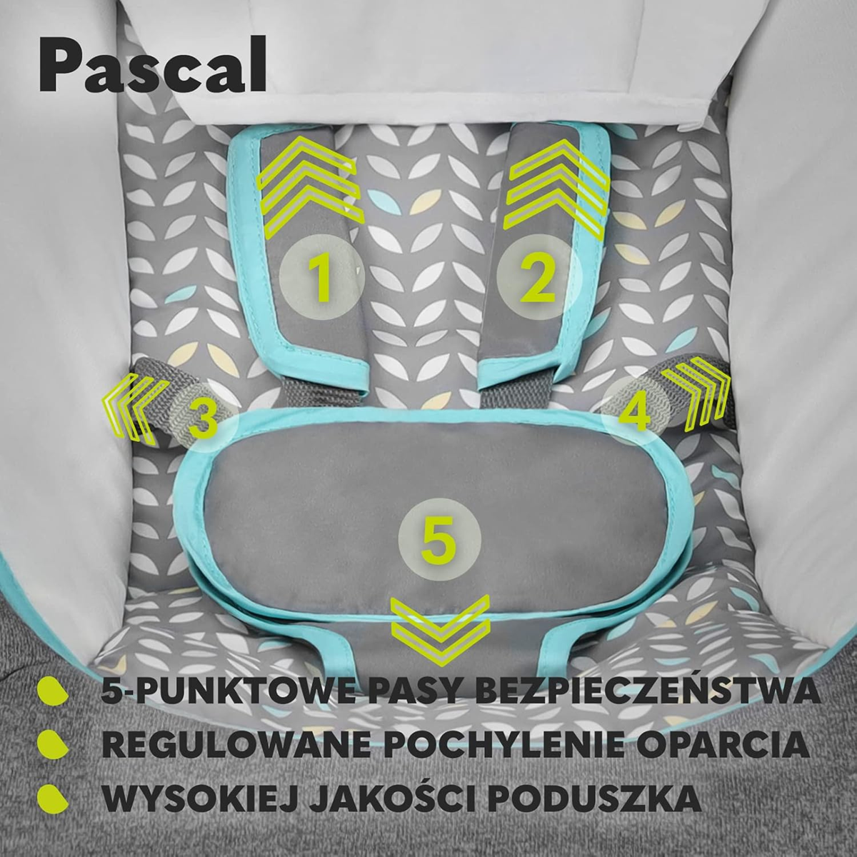 Egy mozdulattal a Pascal hintából kényelmes pihenőszékké alakítható. Az 5 pontos biztonsági öv gondoskodik a baba biztonságáról. A még jobb illeszkedés érdekében a fejtámlán extra párna található, amely stabilizálja a fejet. A kiváló minőségű, bőrbarát kárpit mosógépben mosható.