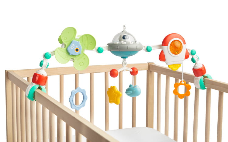 A Toyz Kosmos babakocsi játékív csodálatos szórakozást és szenzoros fejlődést biztosít gyermekednek. Különféle játékokkal van felszerelve, amelyek célja a gyermek mozgásának és kíváncsiságának fejlesztése.Kiemelkedő eleme az elemmel működő, világító zenei panel forgó körhintával, amely lágy dallamokat játszva segíti a baba elaltatását. A rugalmas és hajlítható rögzítésnek, valamint a patentoknak köszönhetően a Kosmos játékívet könnyedén fel lehet akasztani vagy rögzíteni nemcsak babakocsira, hanem szinte bármilyen helyre (autósülésre, hintaszékre, pihenőszékre, etetőszékre vagy kiságyra) is.