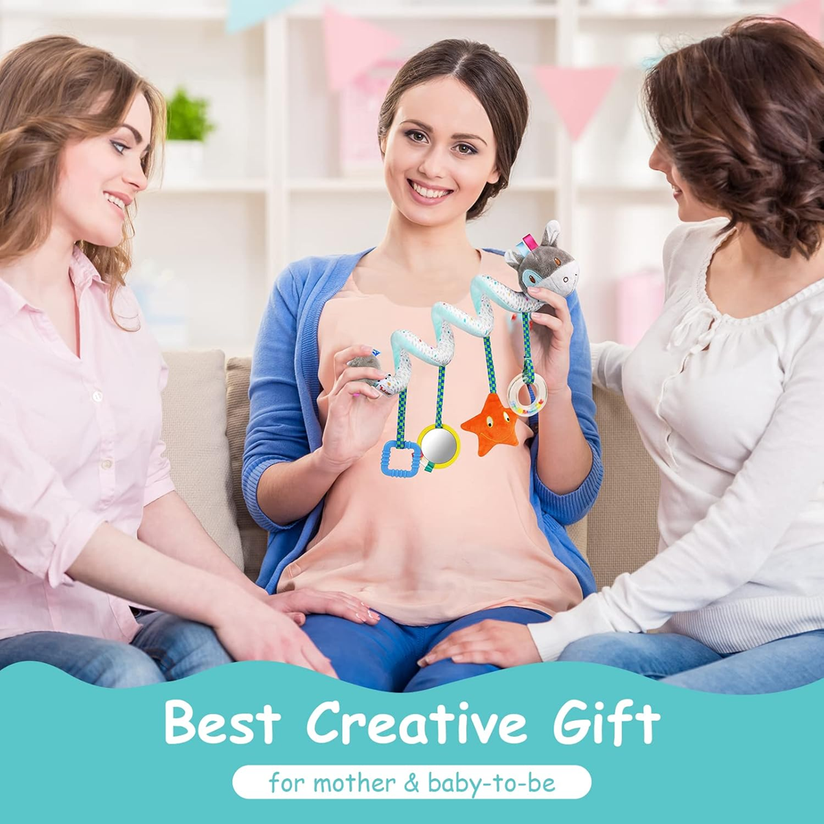 Univerzális rögzítés: a spirál forma könnyen feltekerhető babakocsira, kiságyra, autósülésre vagy játszószőnyeg ívére – otthon és utazáskor is.