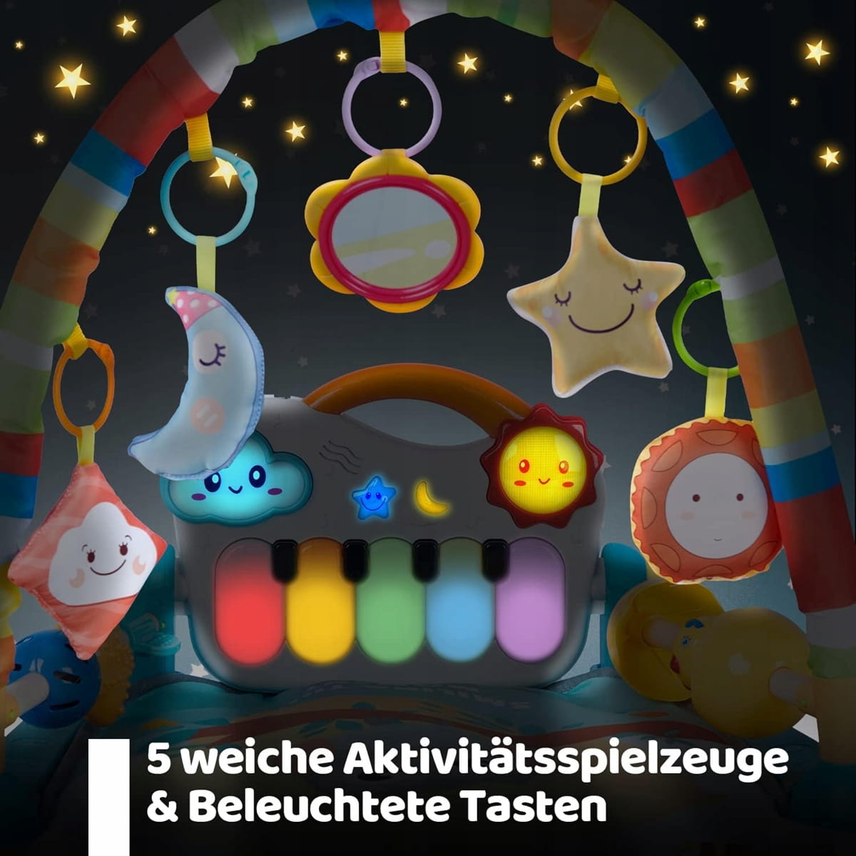 - Teljes tartozékkészlet: Babatornánk tartalmaz egy érintős zongorát és párnázott szőnyeget, 5 levehető színes csörgőt és 4 textil játékot kis tükörrel. Több mint 50 dallam és 8 LED fény (beleértve a vetítőfényt és a skálákat) biztosítja a végtelen szórakozást a célzott korosztály számára.